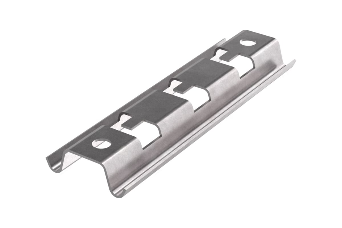 Омега-профиль горизонтальный безвинтовой применяется для подвеса лотка на шпильку. Для фиксации лотка необходимо согнуть лепестки кронштейна шлицевой отверткой.
